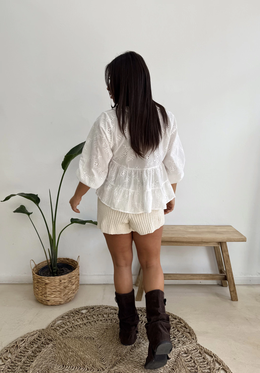 Blusa de broderie con tiras para atar en el frente y manga globo.