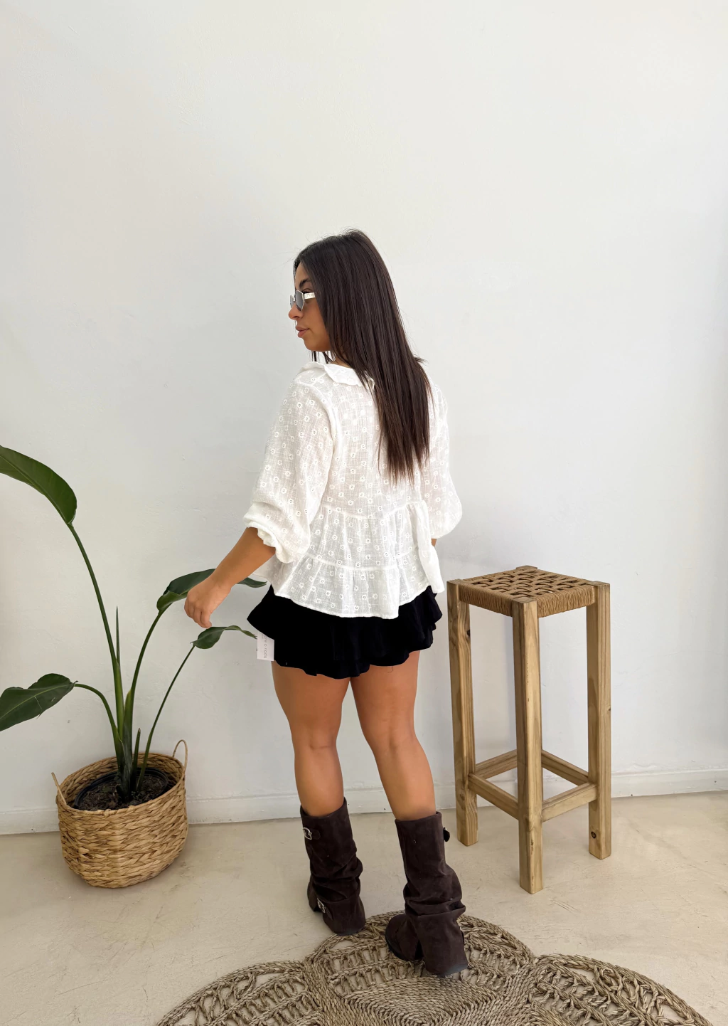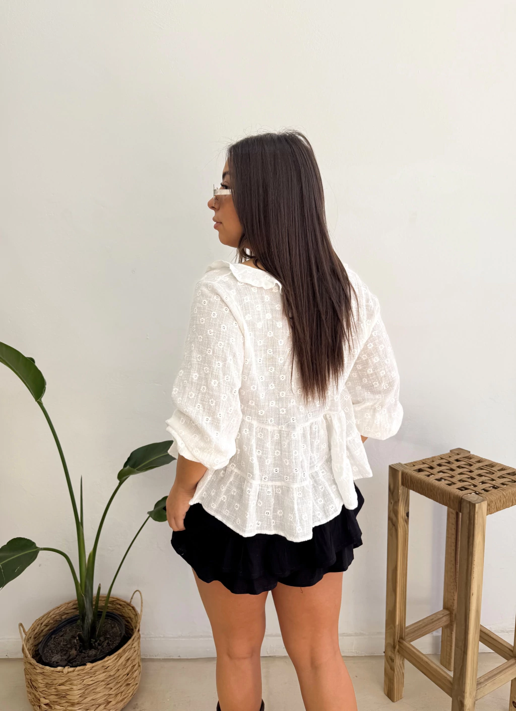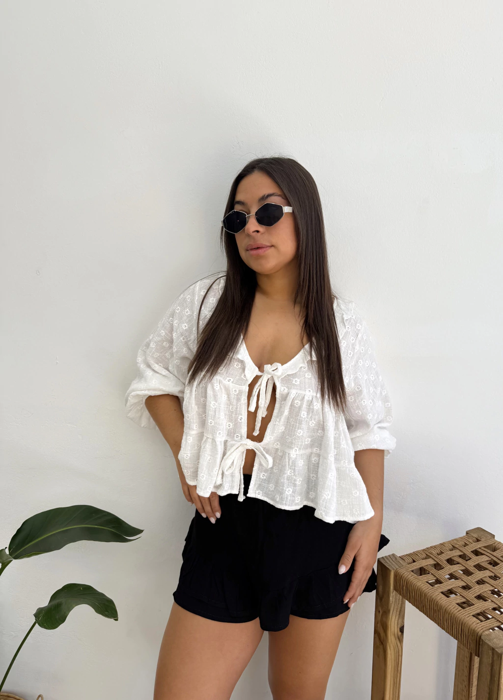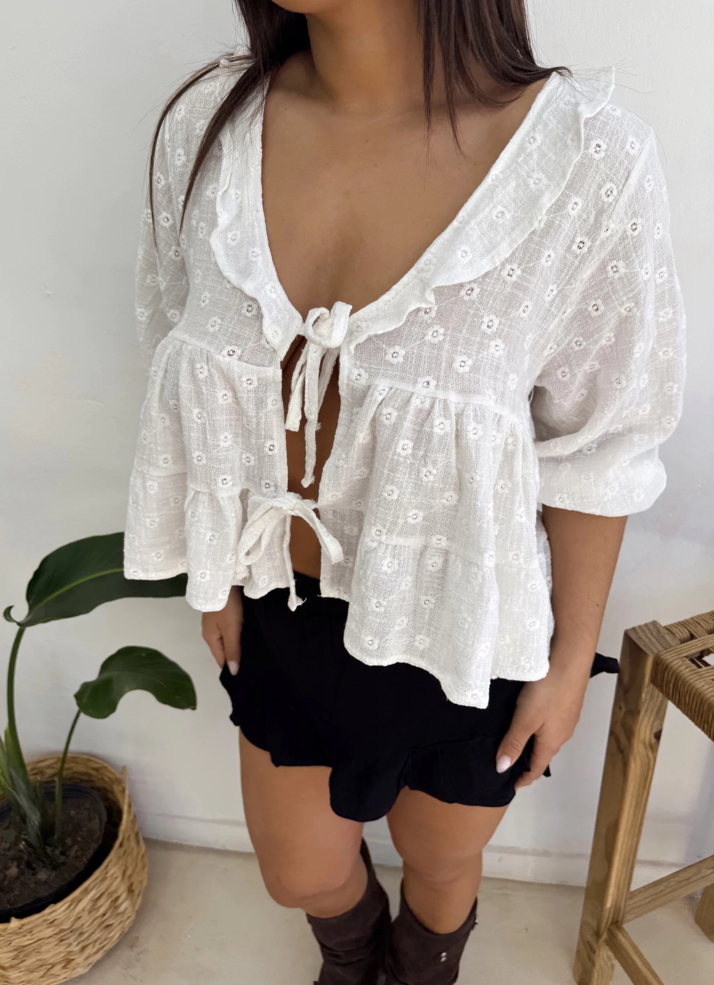 Blusa de broderie algodón con volados en el escote y lazos para atar en el frente. Mangas con puños elastizados. Talle único: