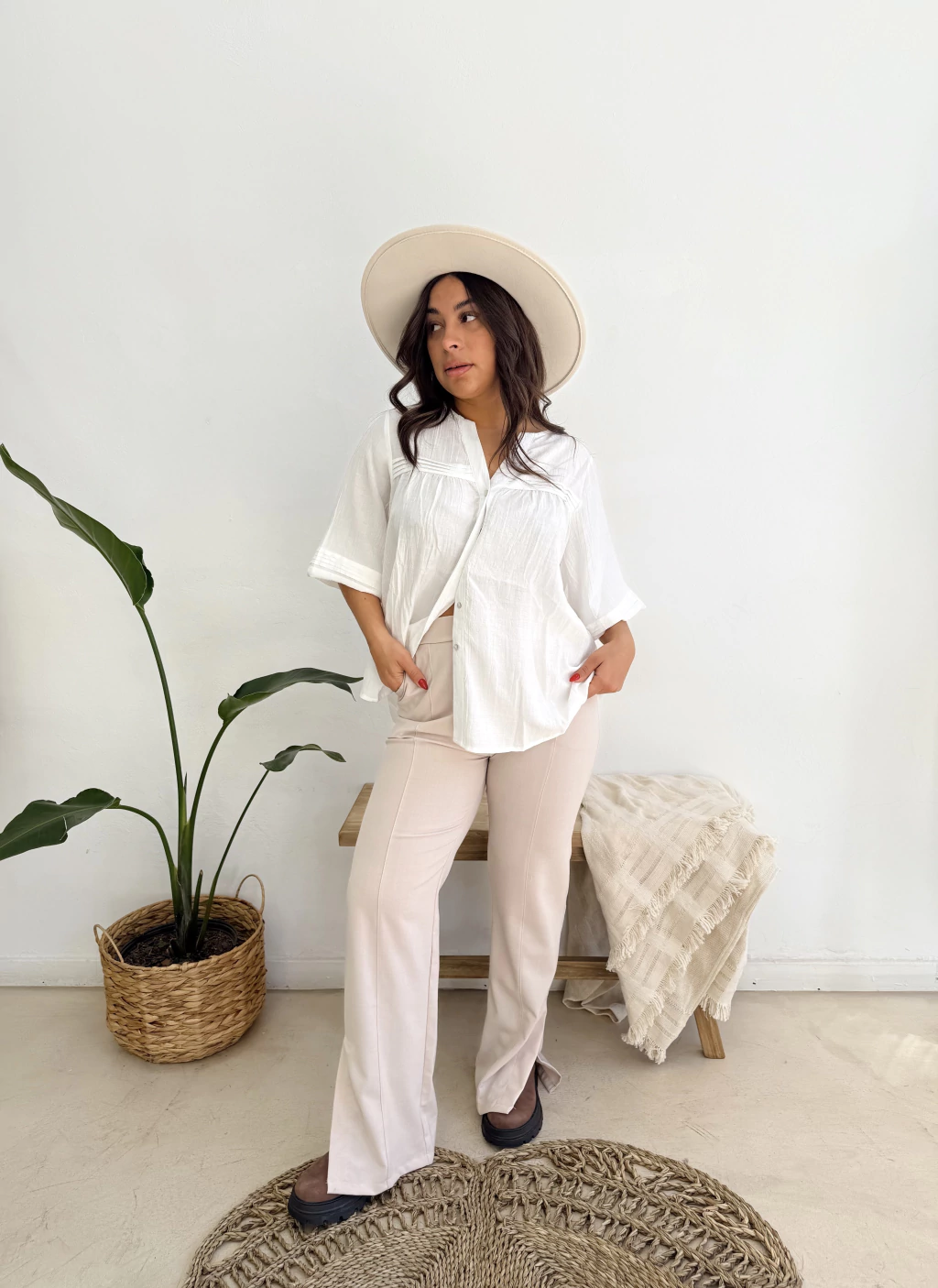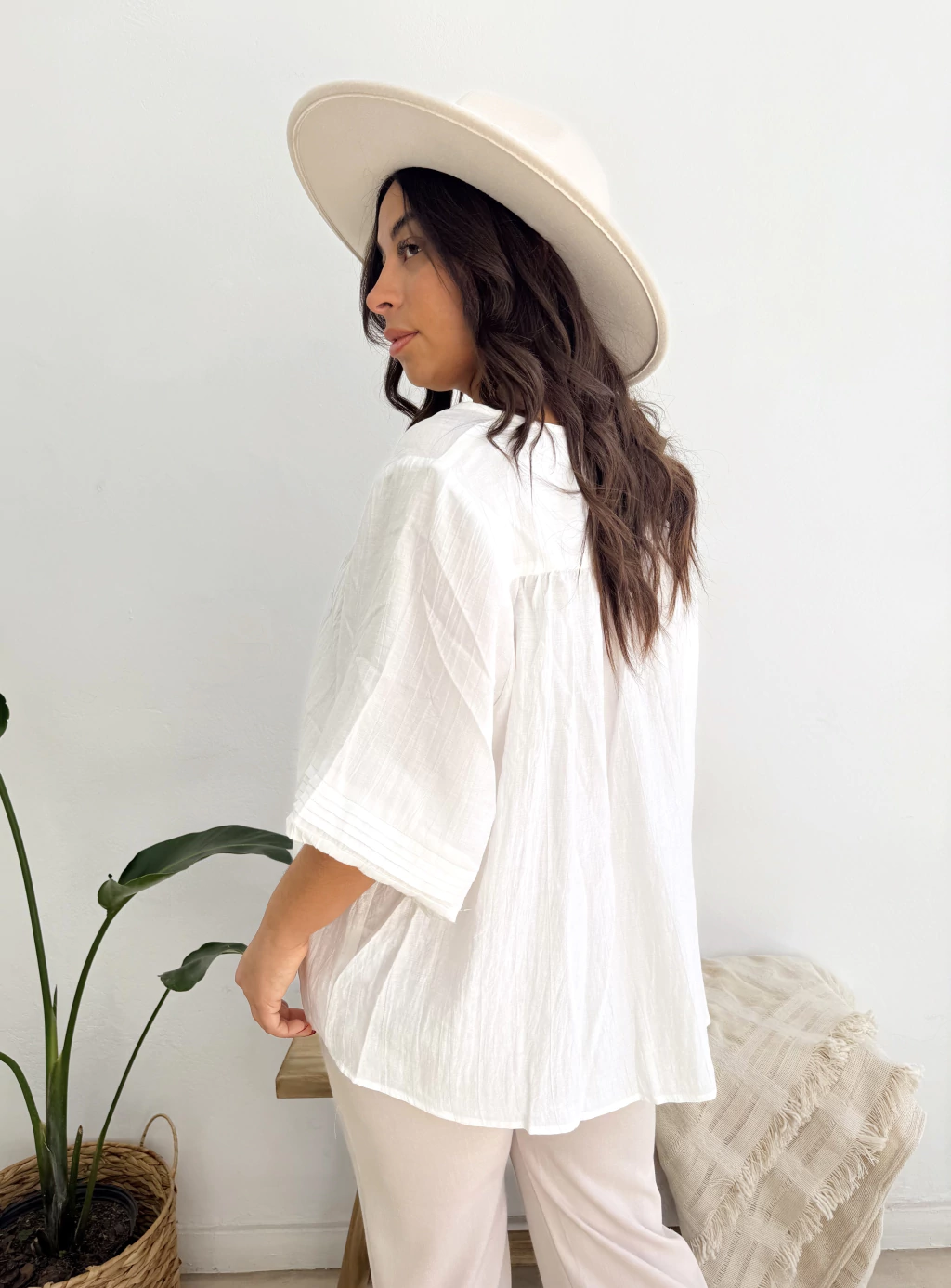 Blusa de bambulo con frente y mangas plizadas. Manga 3/4 con puños elastizados. Botones en el frente y cuello Mao. Talle único: