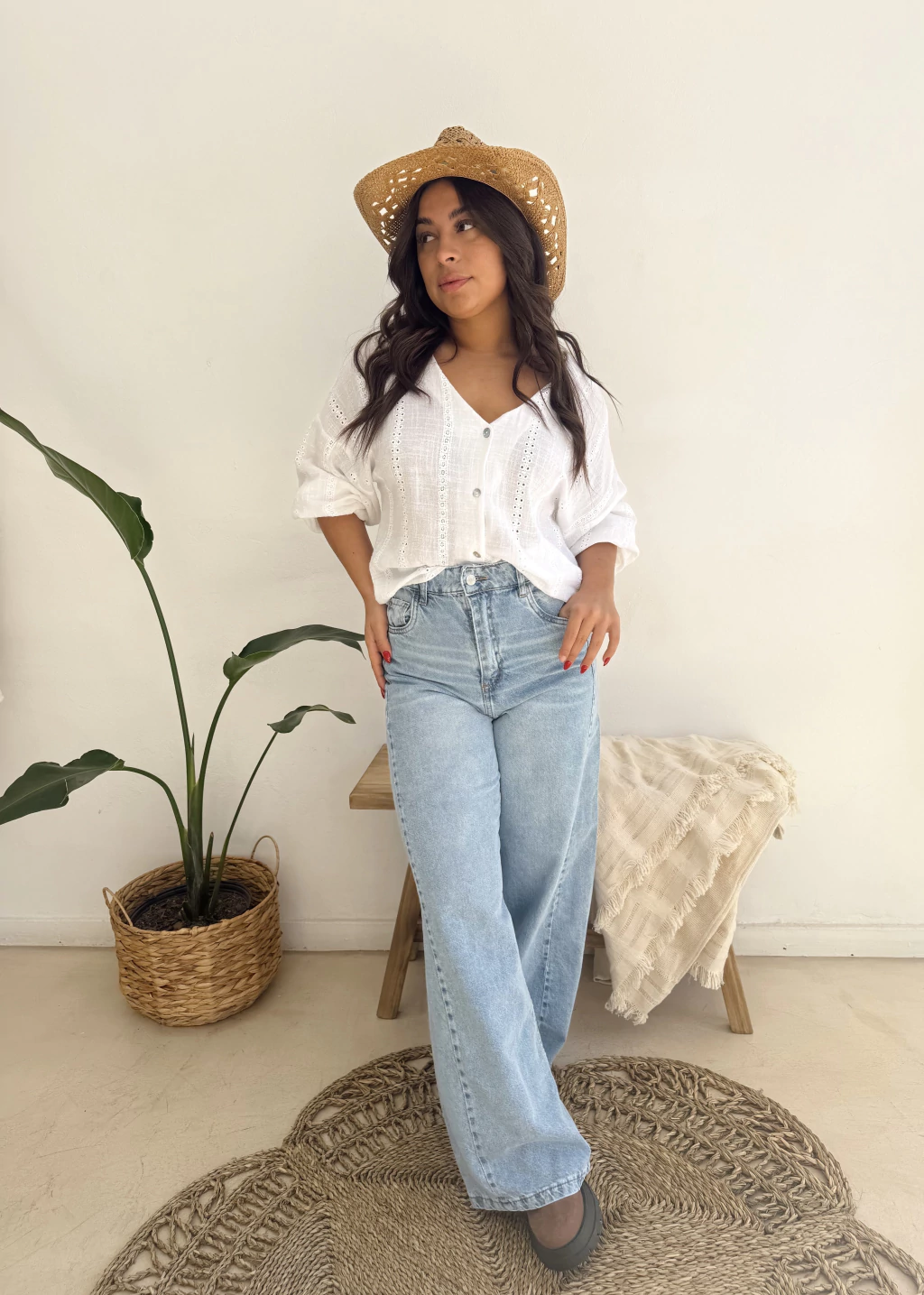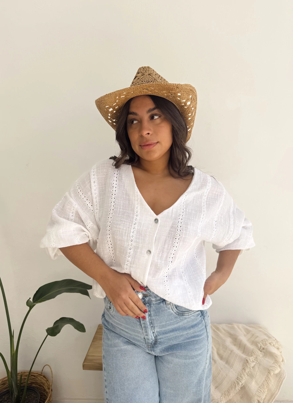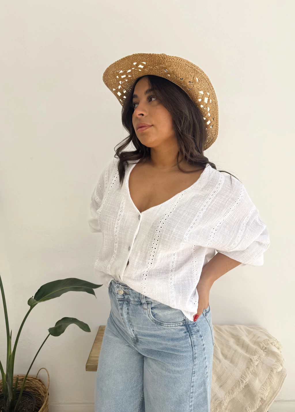 Camisa de broderie-lino liviano con manga globo y boones en el frente. Talle único: