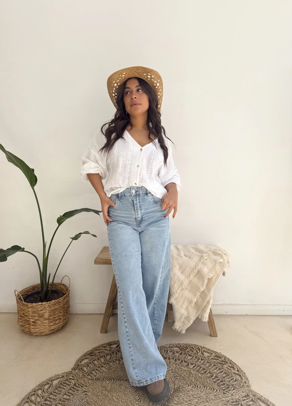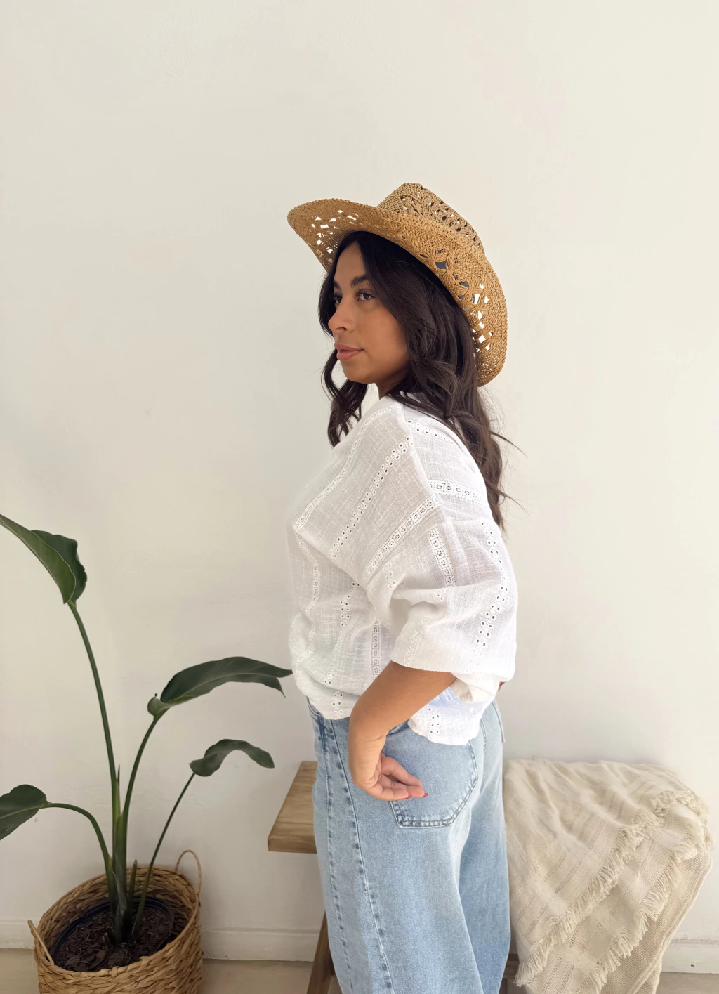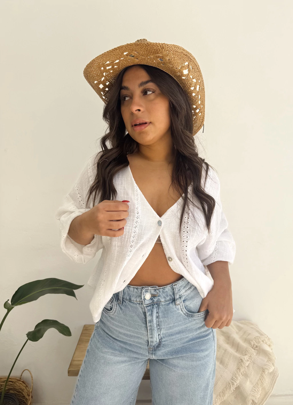 Camisa de broderie-lino liviano con manga globo y boones en el frente. Talle único: