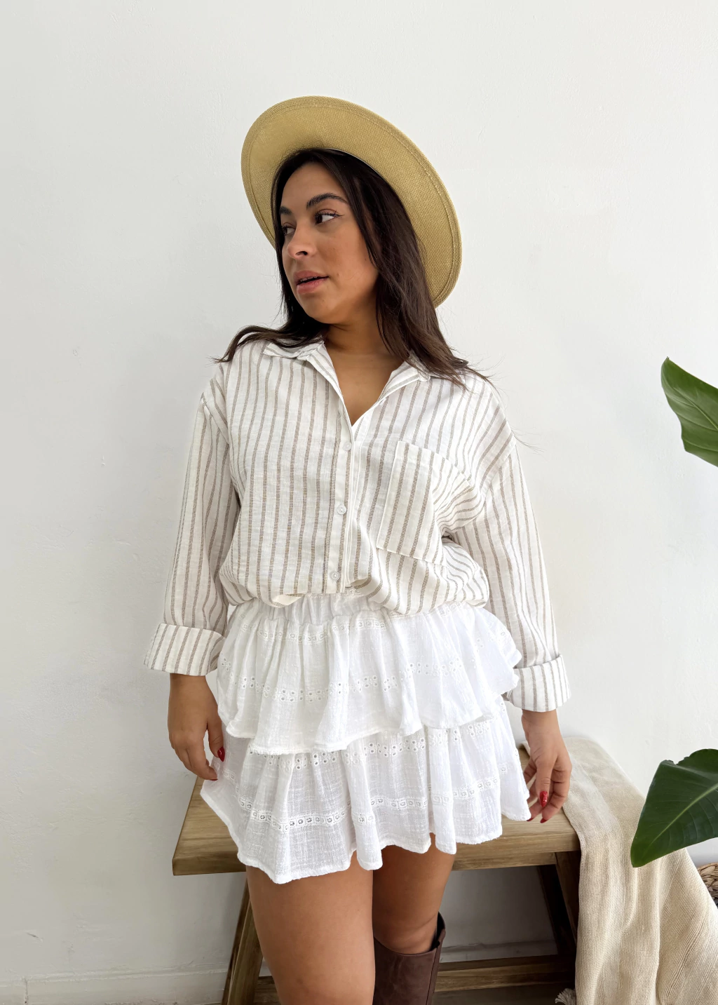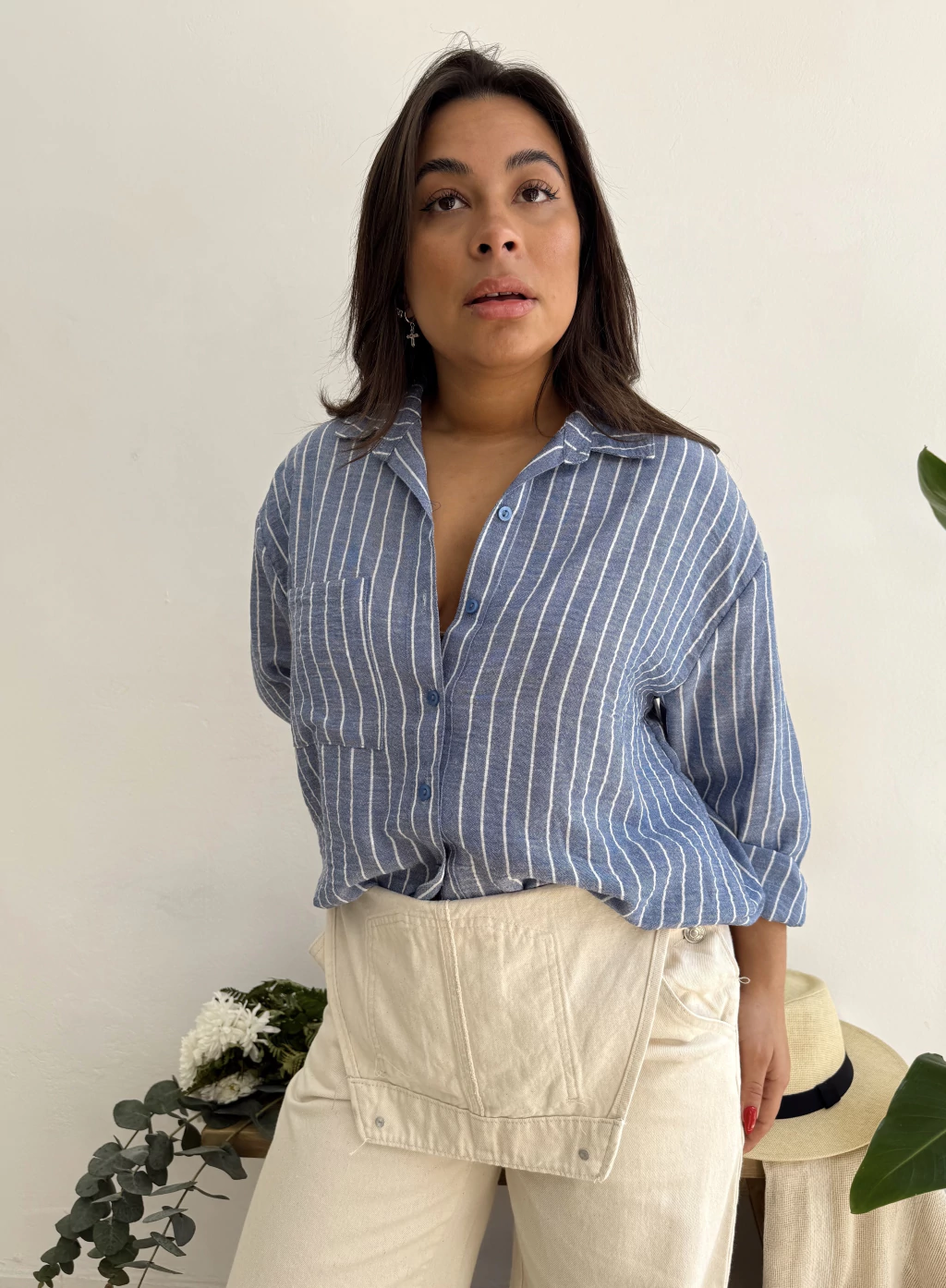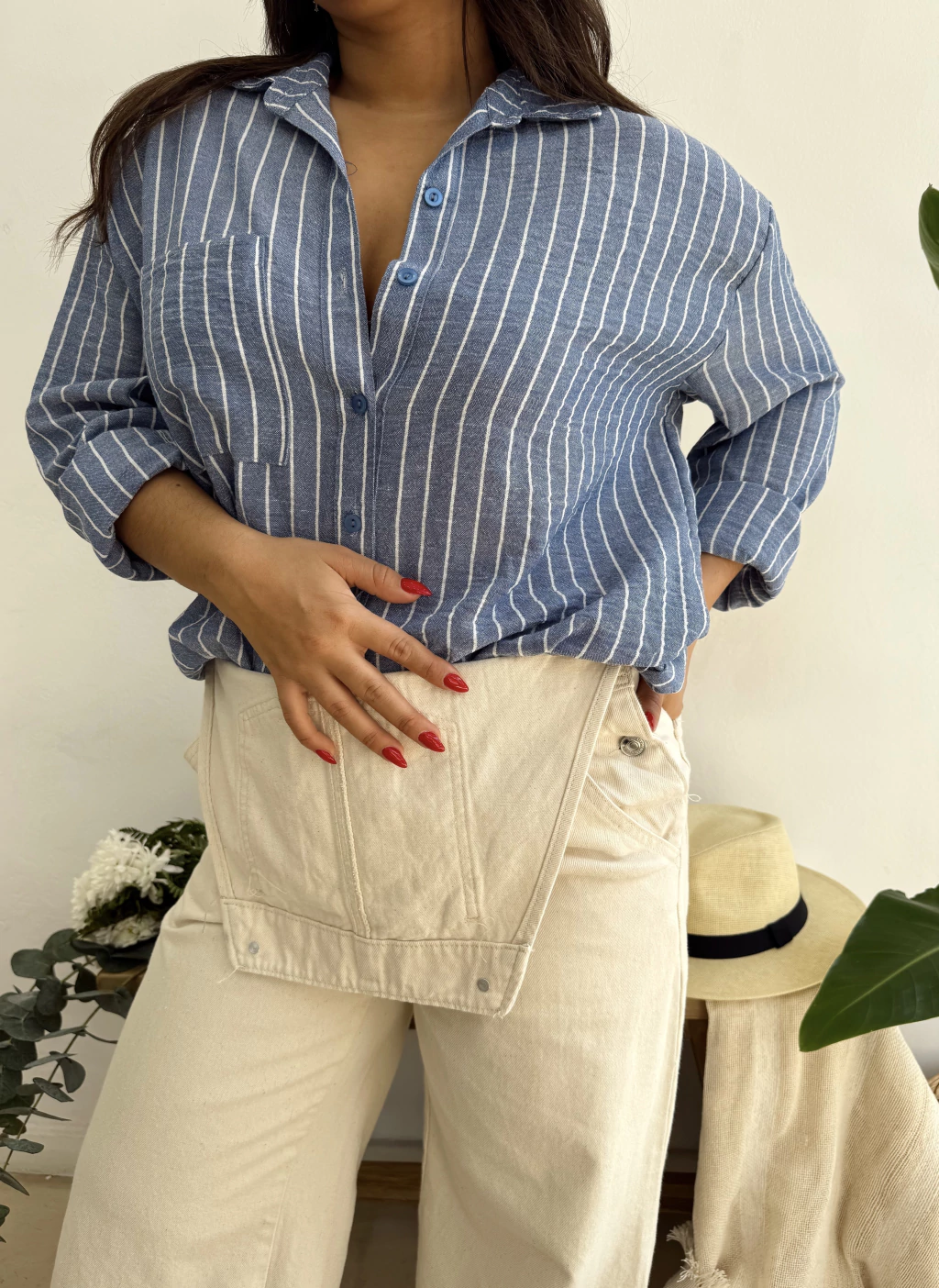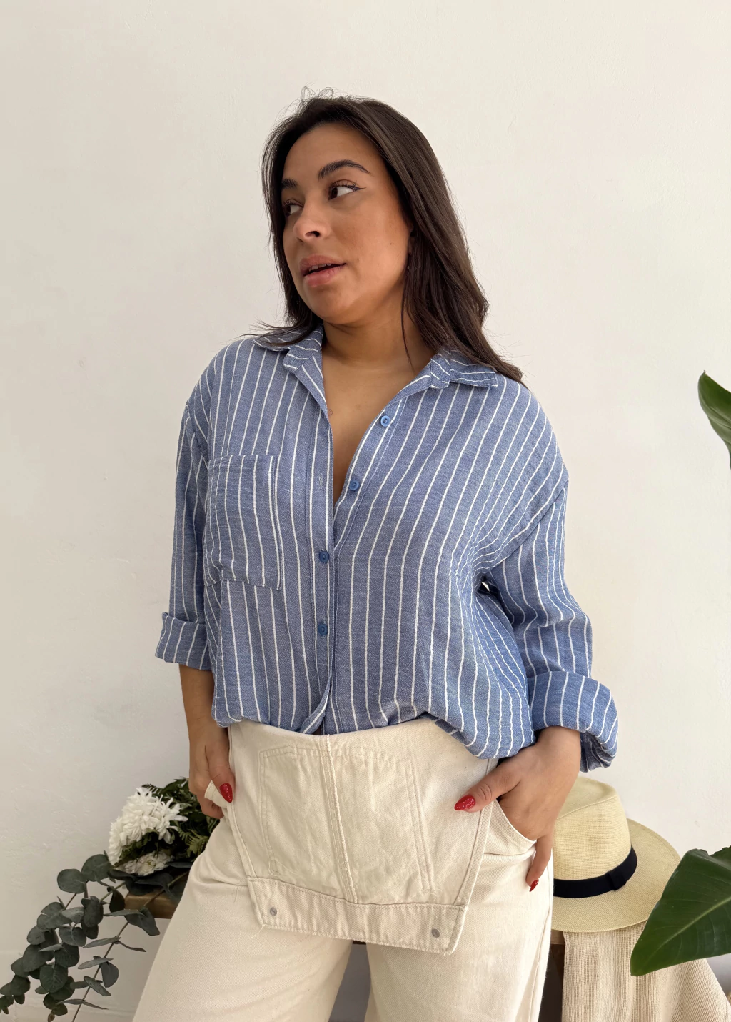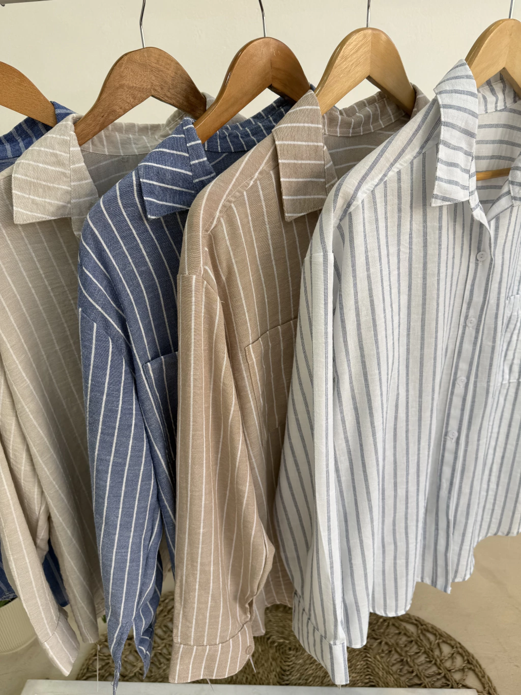 Camisa simil lino rayada cuello con botones y bolsillo frente lado izquierdo manga larga: