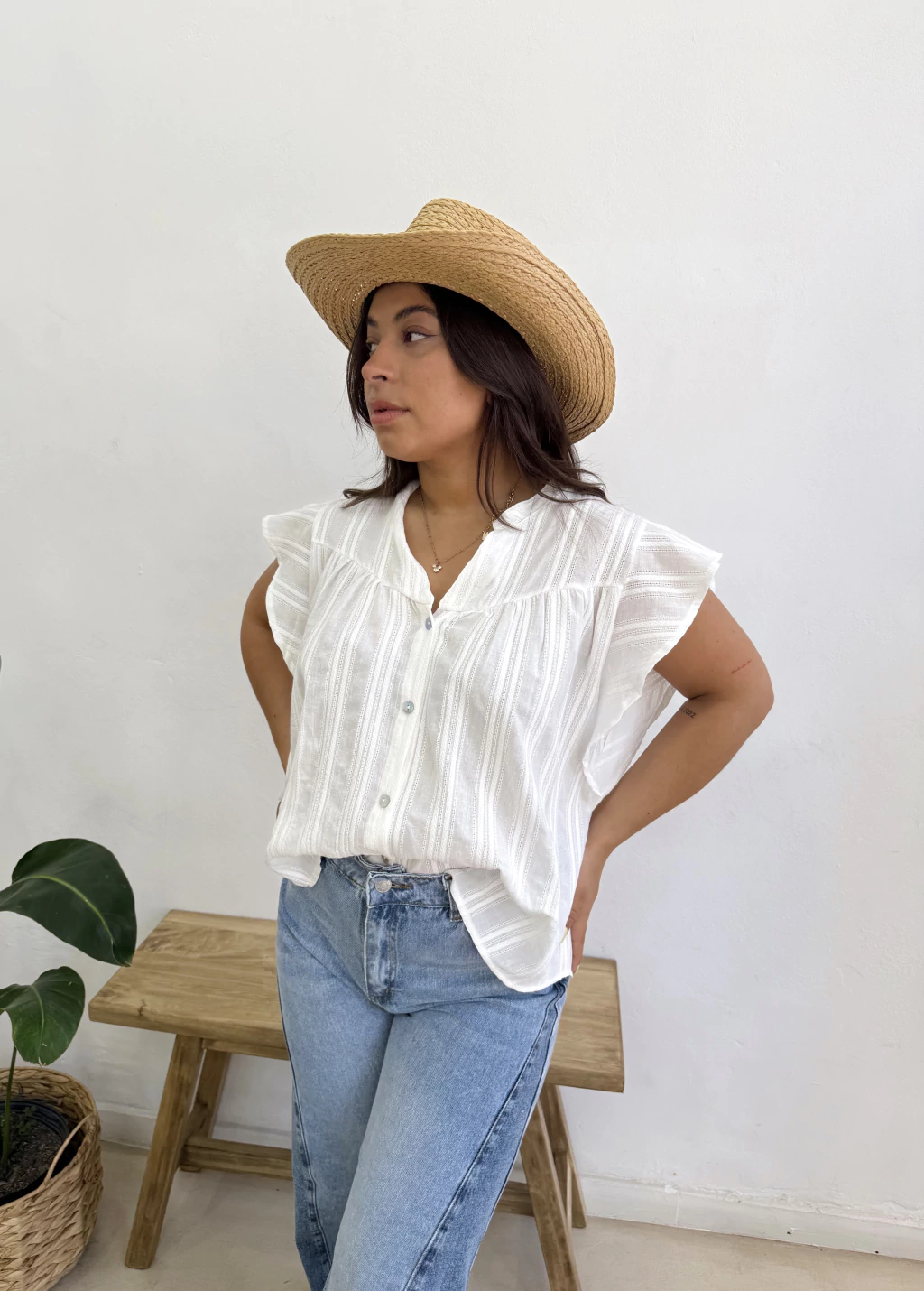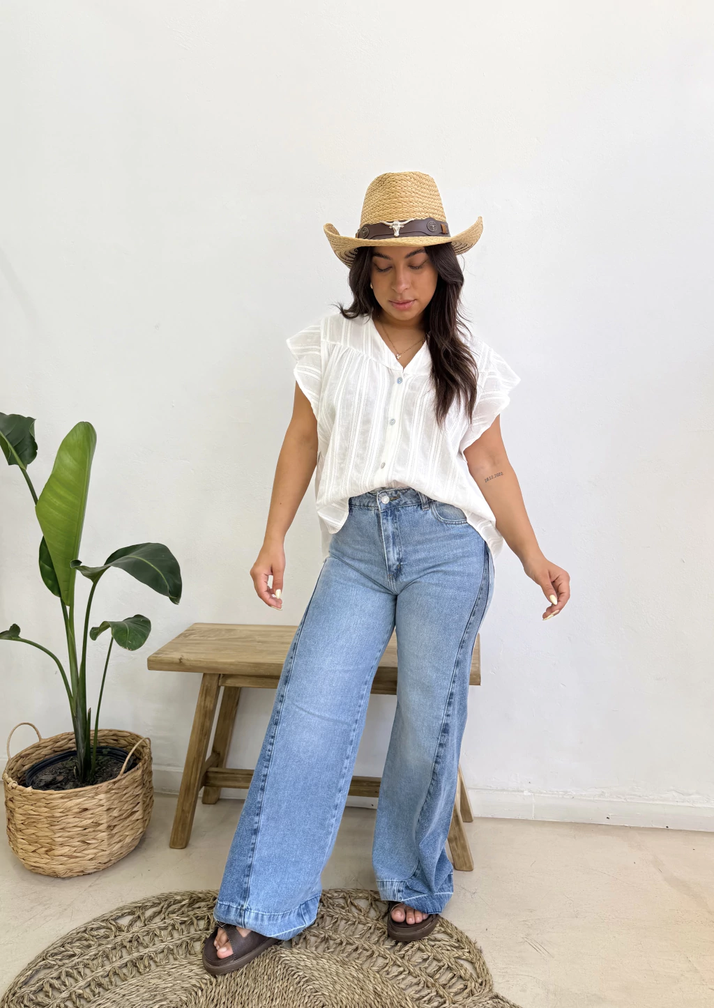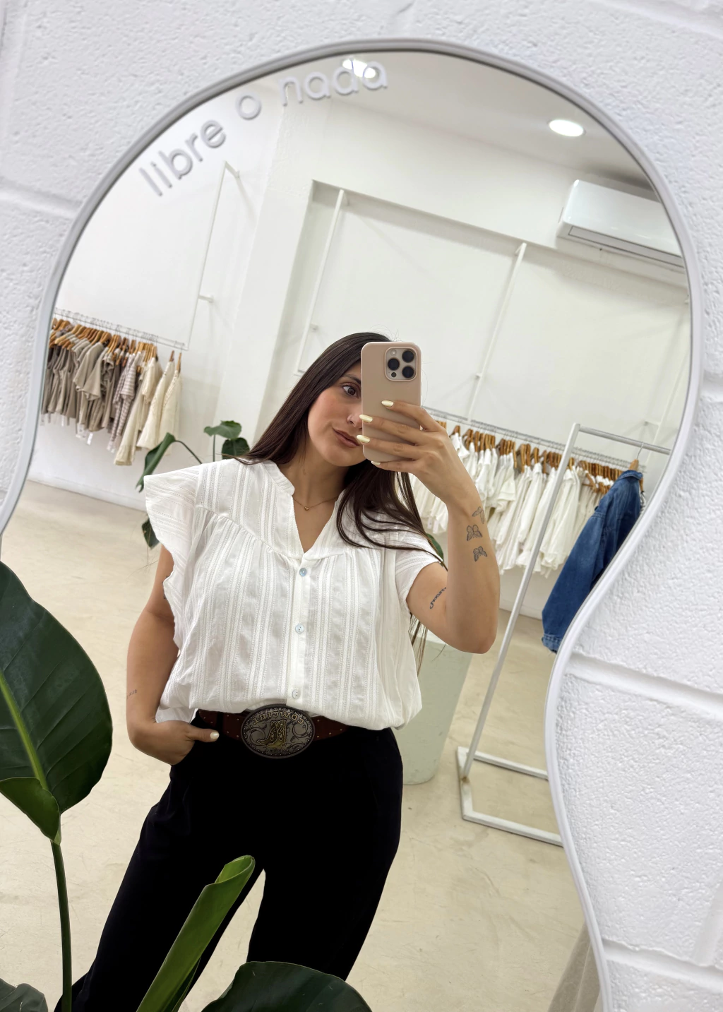 Camisola trenzada con volado en hombros, botones y cuello mao. Medidas: