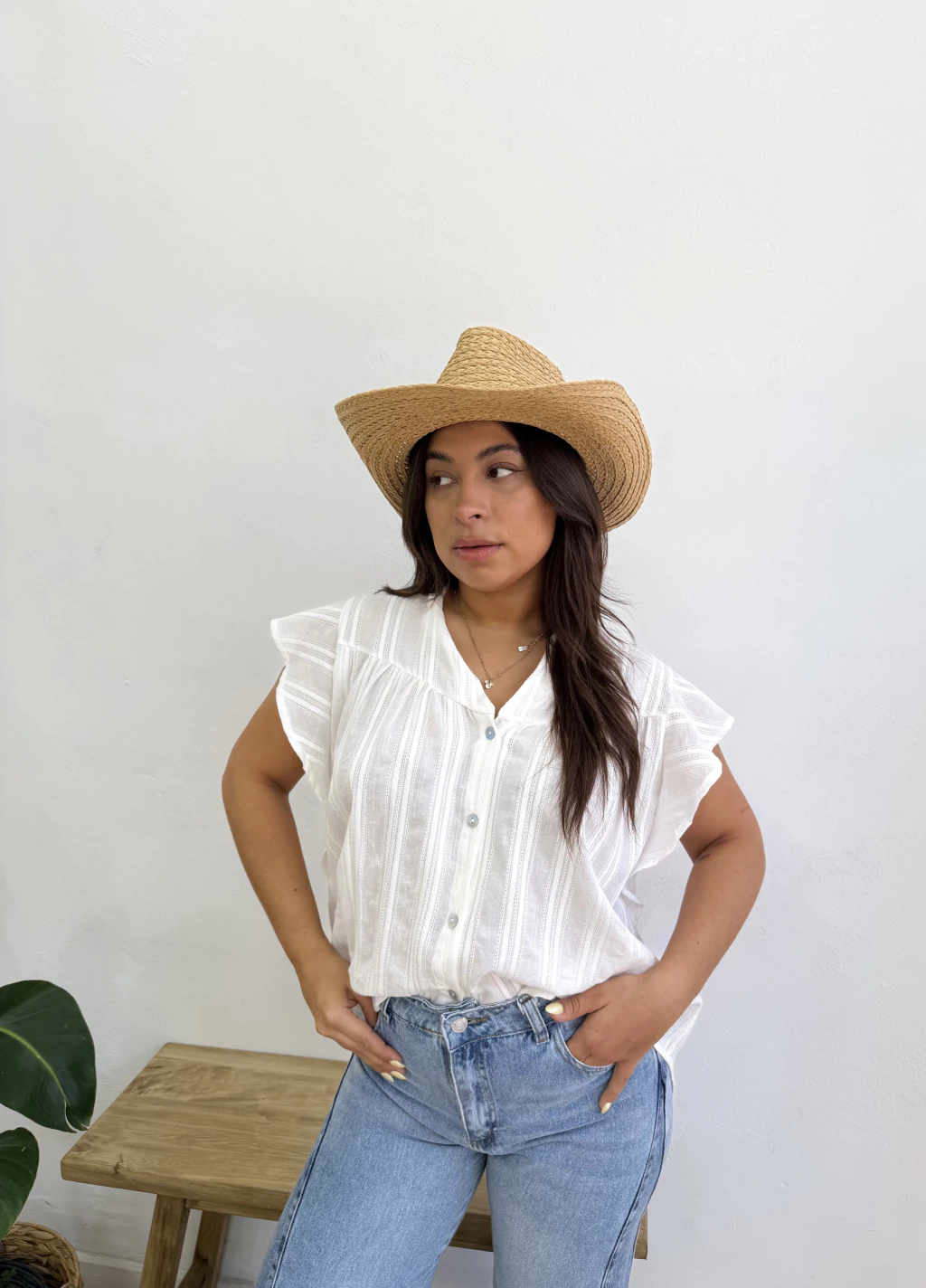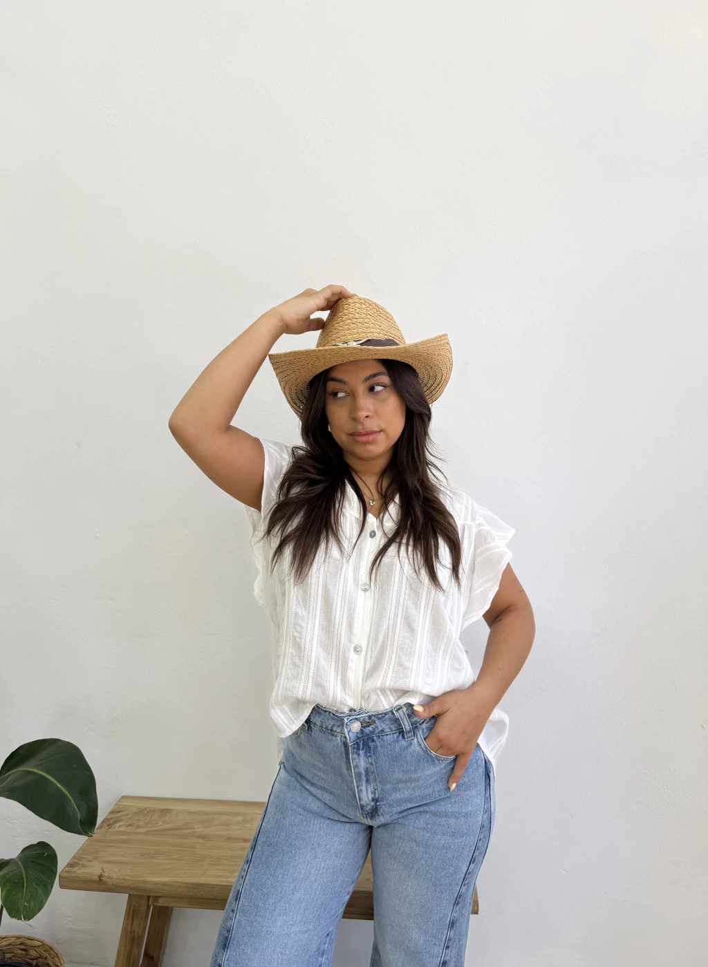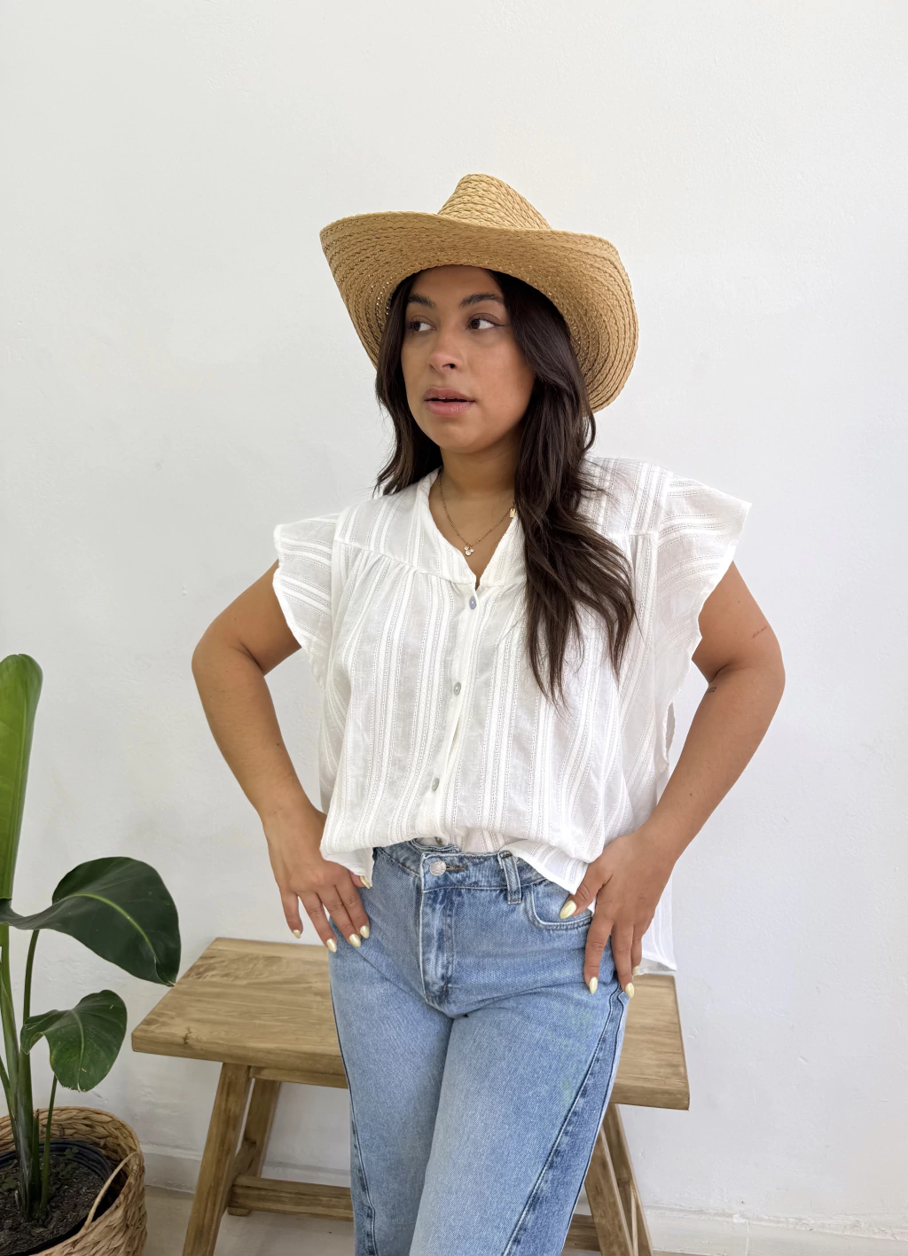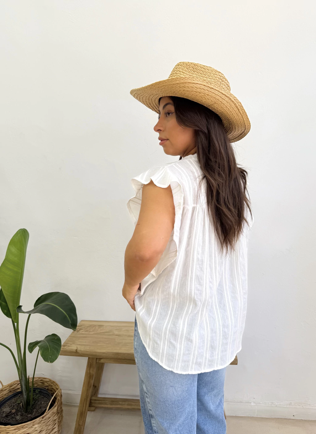 Camisola trenzada con volado en hombros, botones y cuello mao. Medidas: