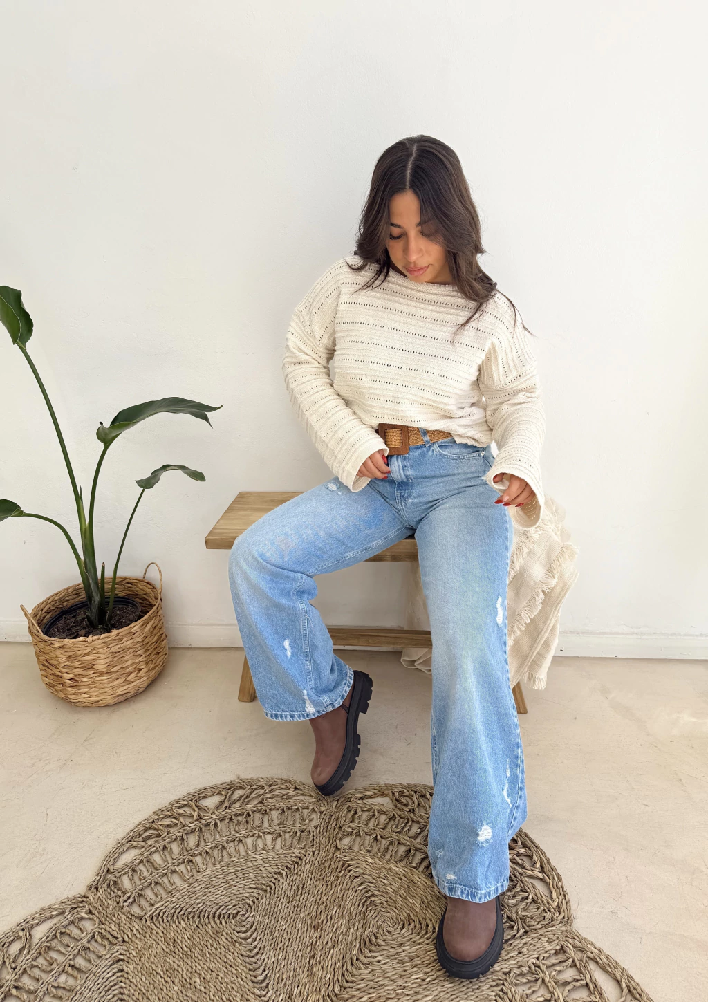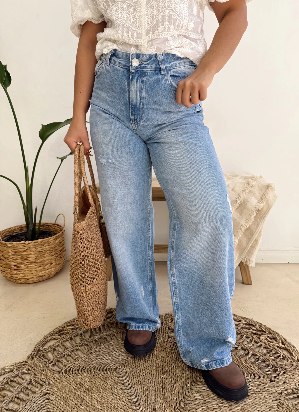 Jean Wide Leg rígido tiro medio con detalles de pequeñas roturas. Tabla de talles: