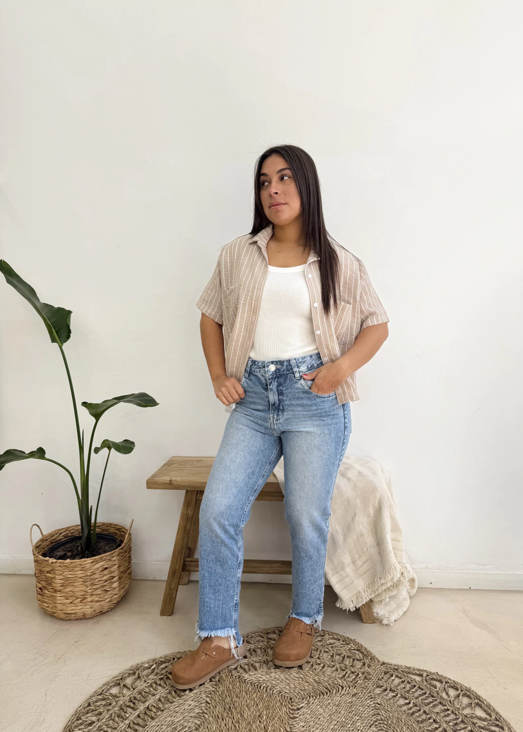 Jean estilo mom fit con botamanga asimétrica desflecada, rígido. Tabla de talles: