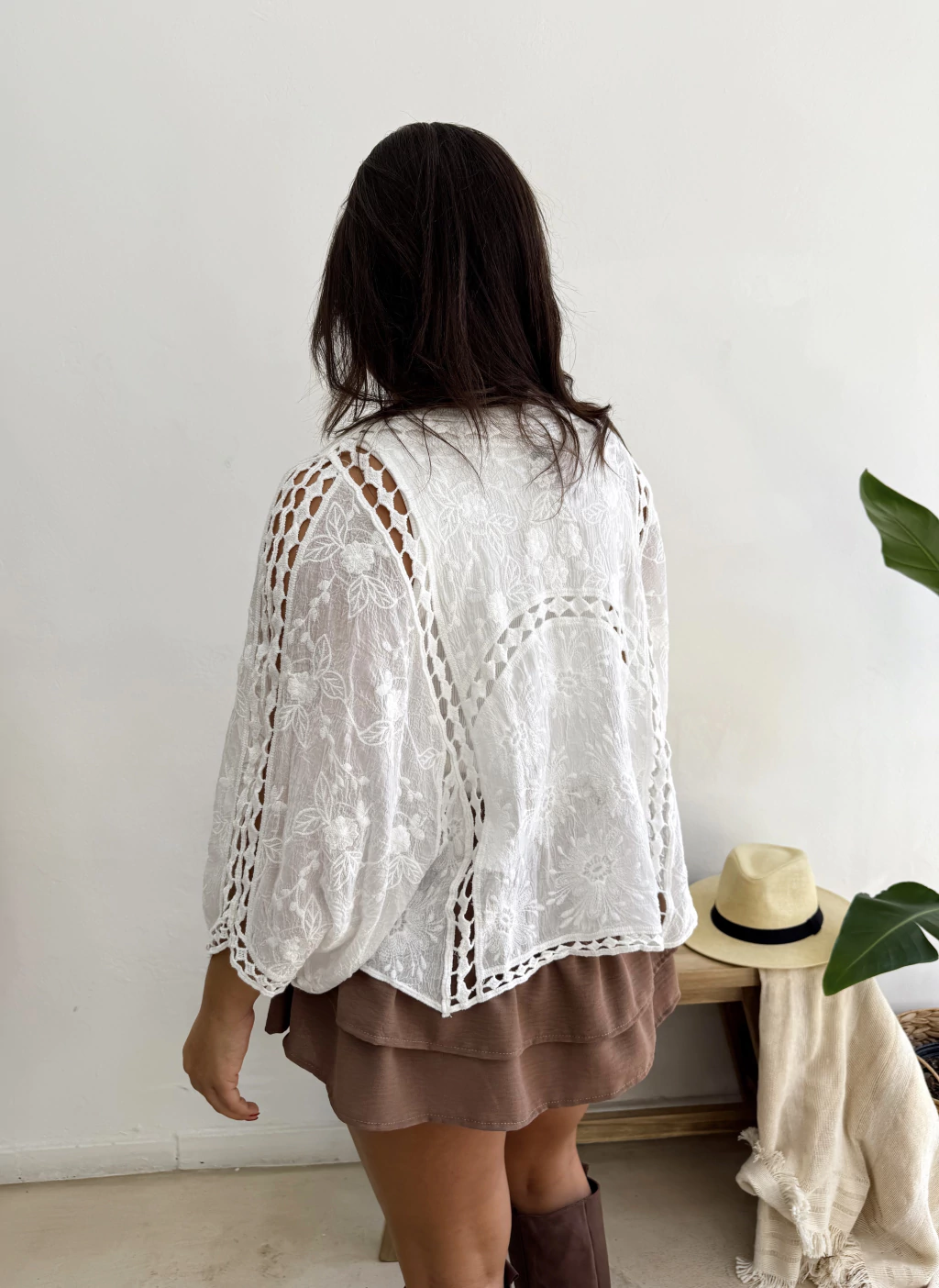 Kimono de tela bordada y mangas muciélado. Talle único: