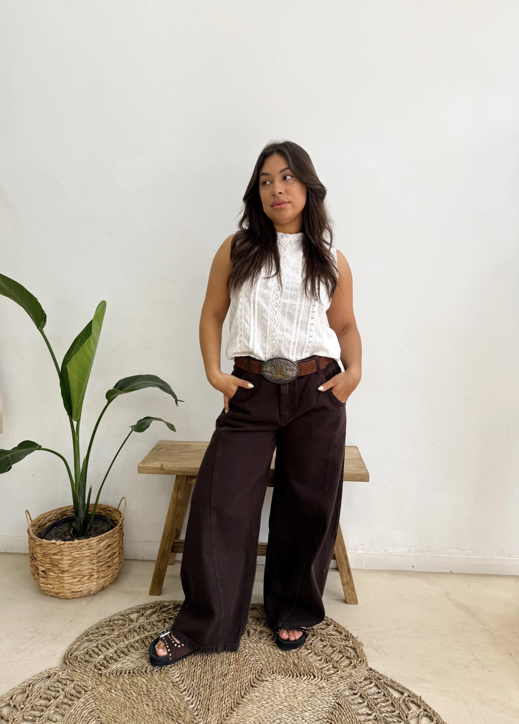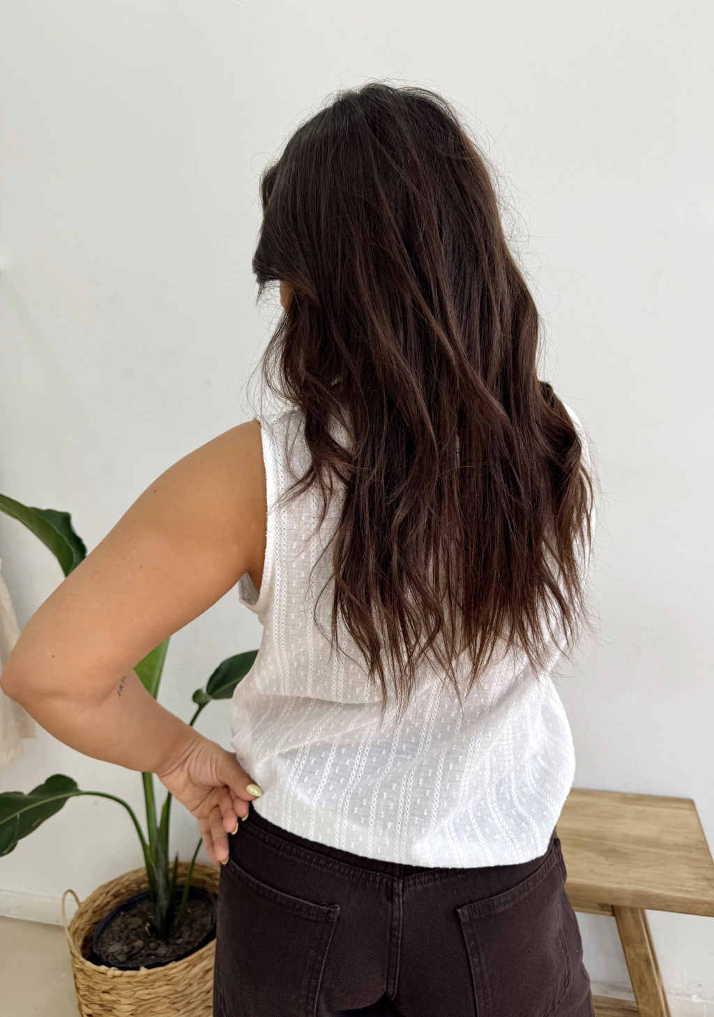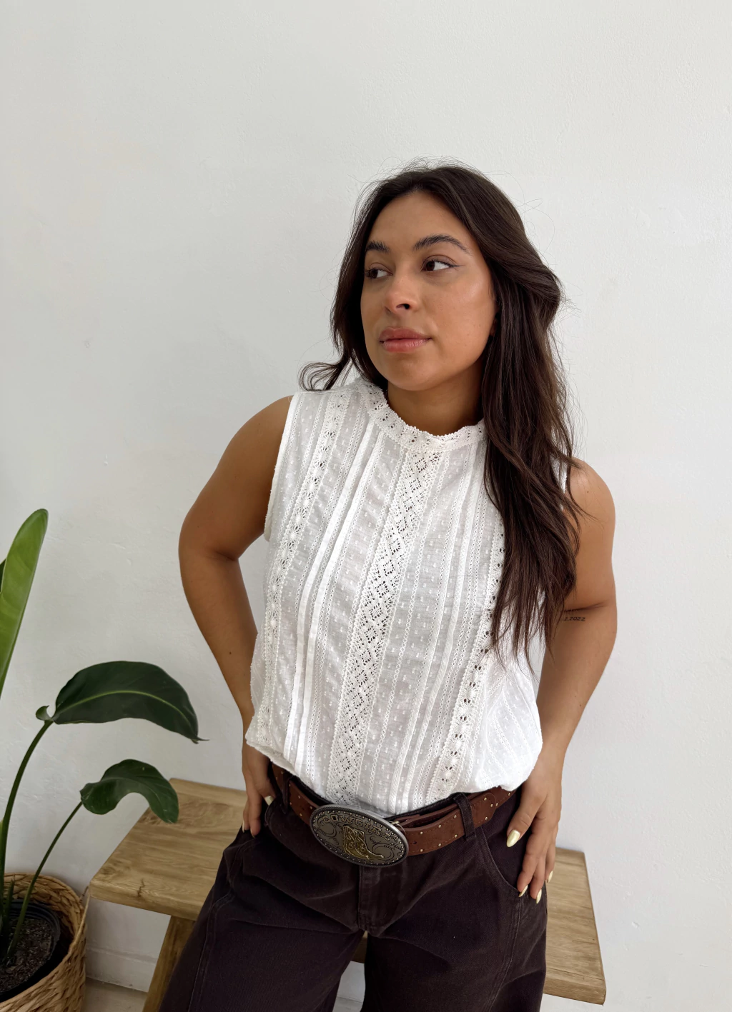 Musculosa cuello con puntilla y puntilla calada en el frente. Talle único: