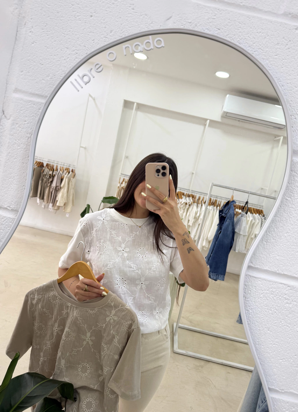 Remera con broderie delantero y espalda de algodón con cuello redondo. Talle único: