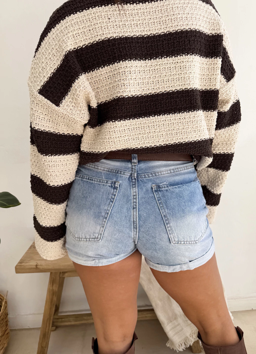 Short de jean estilo mom con ruedo, localizado y costuras en color beige. Tabla de talles: