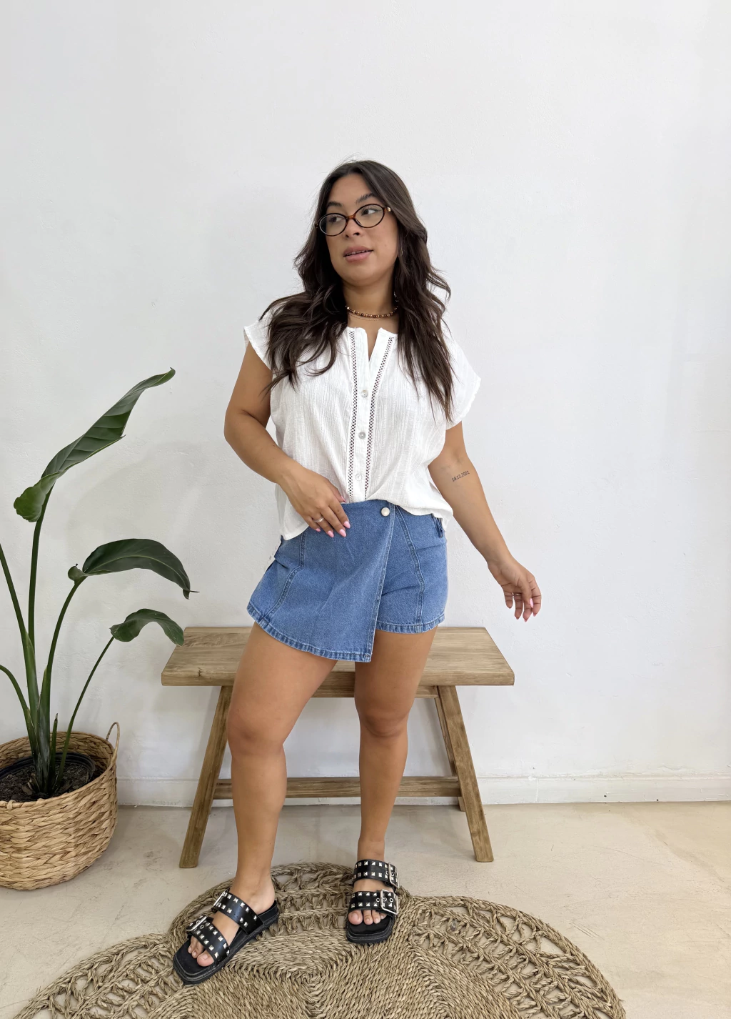 Short pollera de jean azul intermedio rígido con solpa en el frente tiro alto y cierre en lateral.