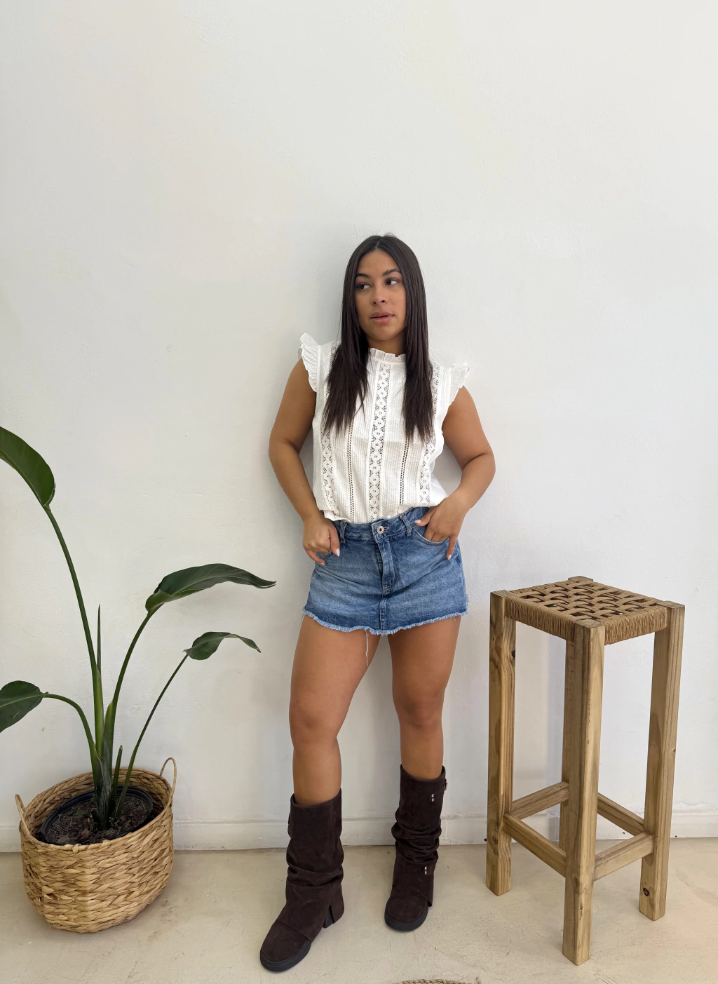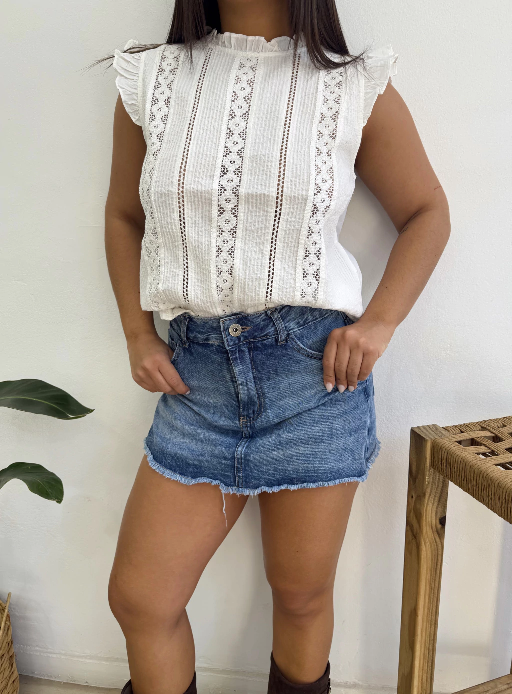 Short pollera azul rígido, tiro medio. Tabla de talles:
