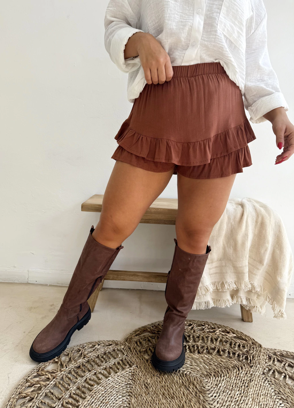 Short de lino con volados y cintura elastizada. Tabla de talles: