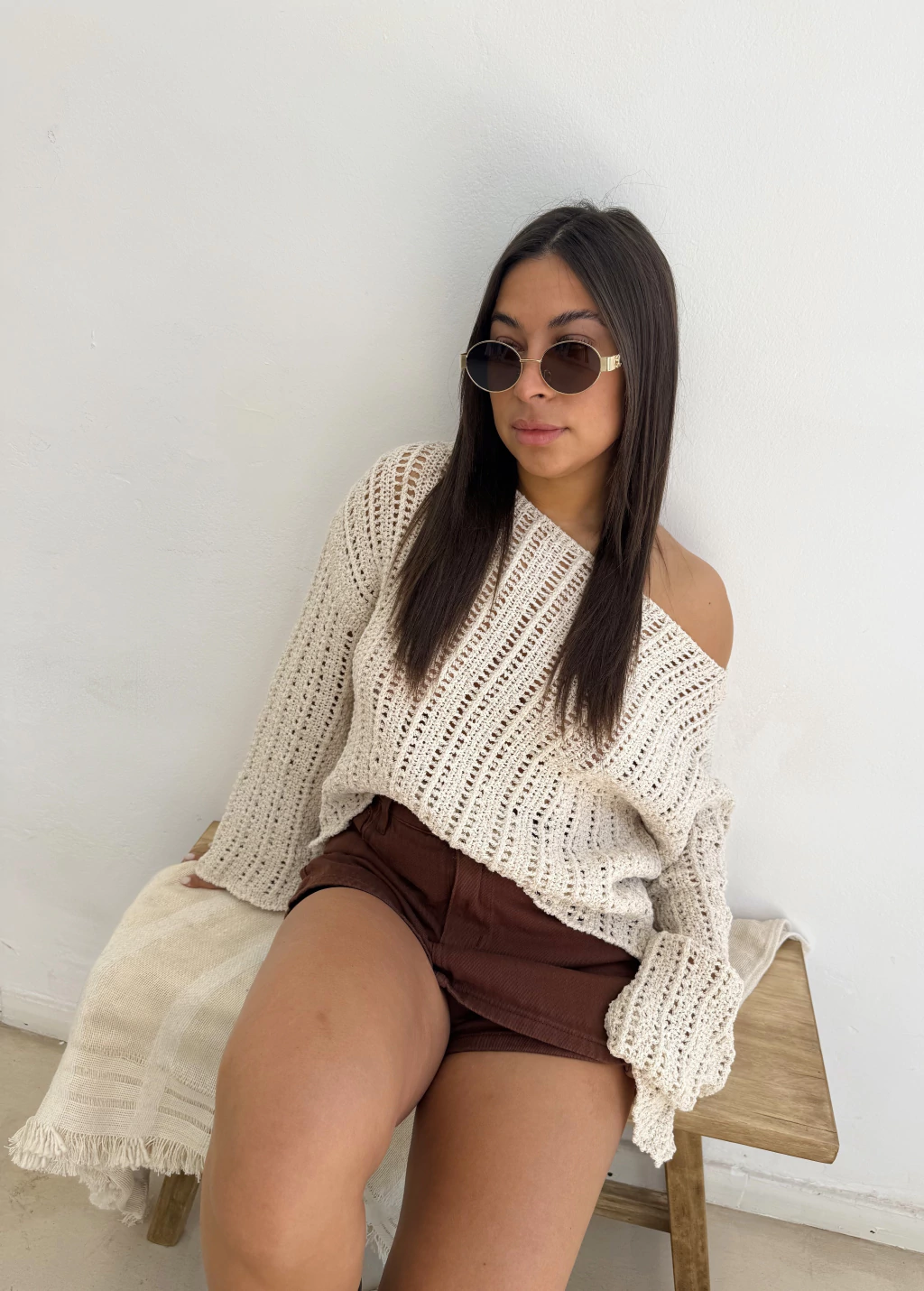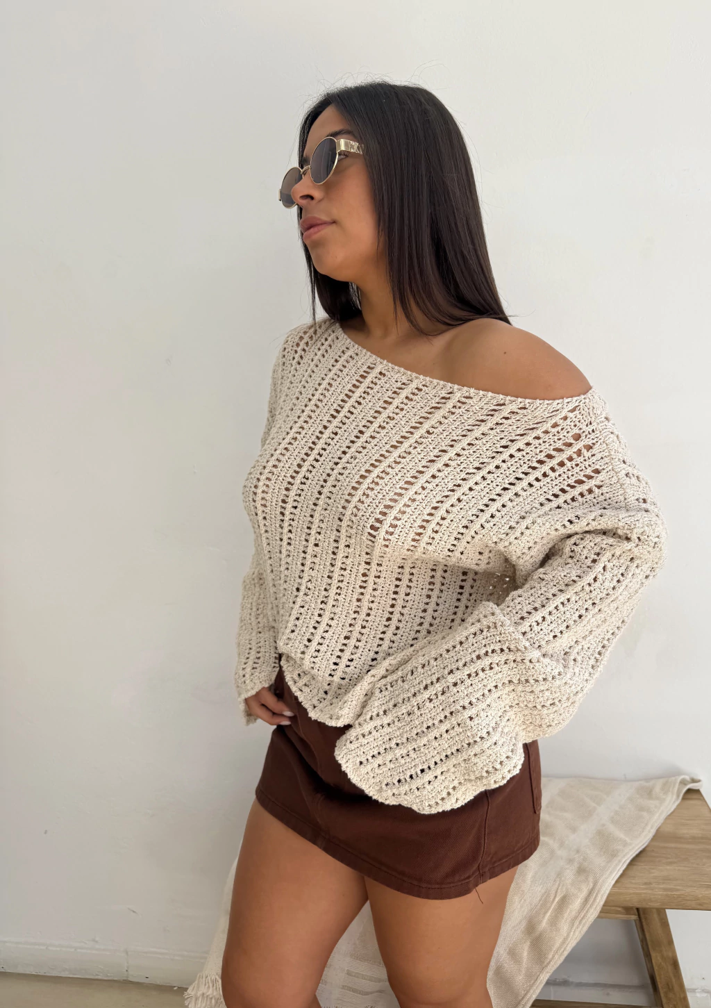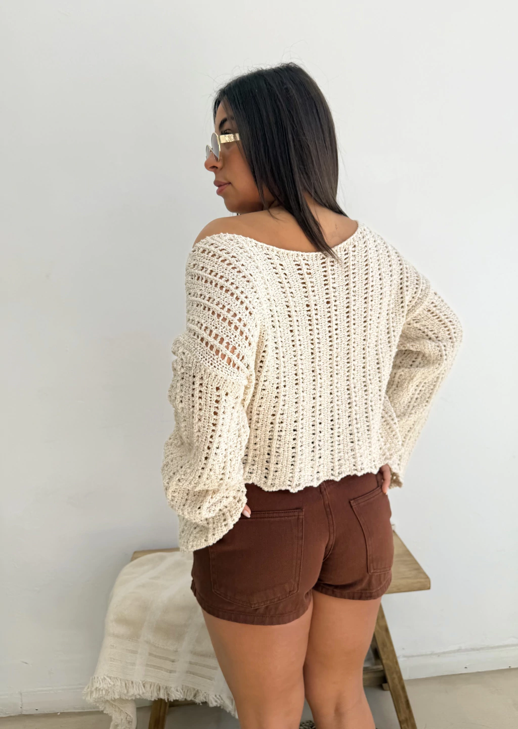 Sweater tejdo con calados, mangas oxford y cuello bote.Medidas: