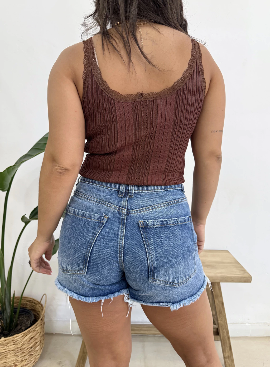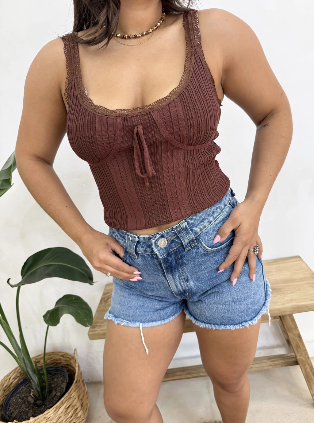 Top de hilo con breteles de encaje. Contorno elastizado. Talle único: